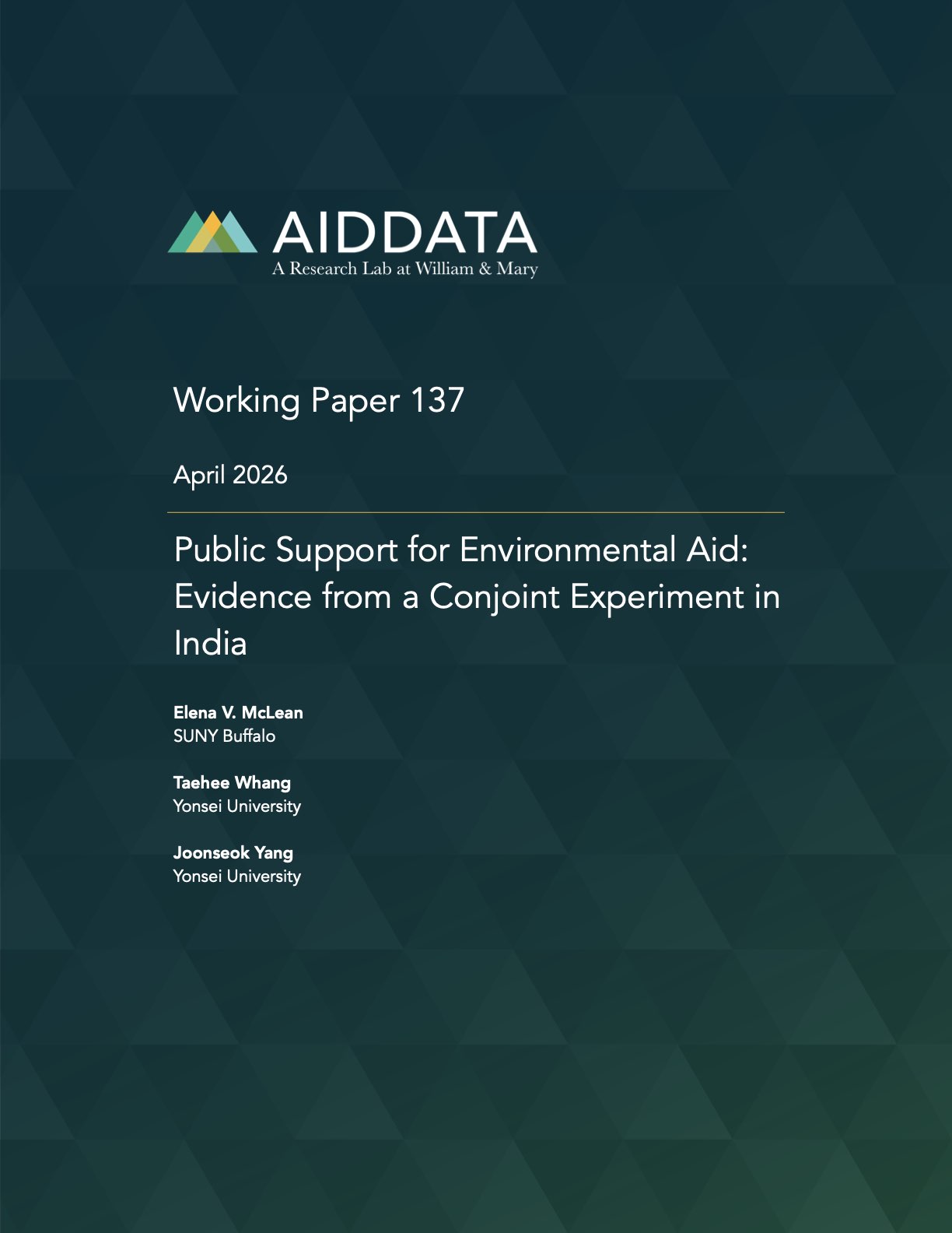 McLean, E., Whang, T., & J. Yang. (2026). Public Support for Environmental Aid: Evidence from a Conjoint Experiment in India. AidData Working Paper #137. Williamsburg, VA: AidData at William & Mary.